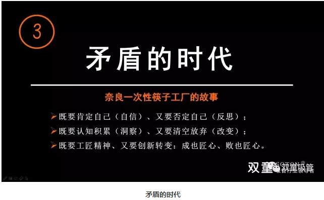 >>>> “矛盾”的時(shí)代:“雙童”樓仲平通過日本奈良一次性筷子的故事告訴大家成也工匠精神、敗也工匠精神,沒有改變,“工匠”精神也沒有用。作為創(chuàng)業(yè)者來講,我們不能用過往的經(jīng)驗(yàn)來理解發(fā)生的一切,否則你會被時(shí)代所拋棄。在不同的時(shí)代,你對時(shí)間和技術(shù)進(jìn)步的理解是不一樣的,既要肯定自己、又要否定自己;既要認(rèn)知積累、又要清空放棄;既要工匠精神、又要?jiǎng)?chuàng)新轉(zhuǎn)變!