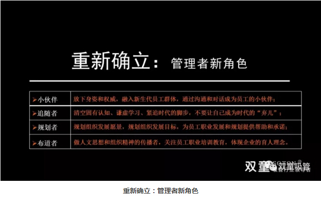 小伙伴:管理者和員工一起平等工作,不要高高在上,放下身姿和權(quán)威,融入新生代員工群體,通過溝通和對話成為員工的小伙伴;