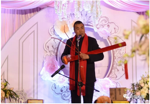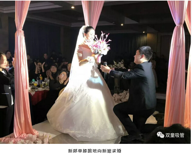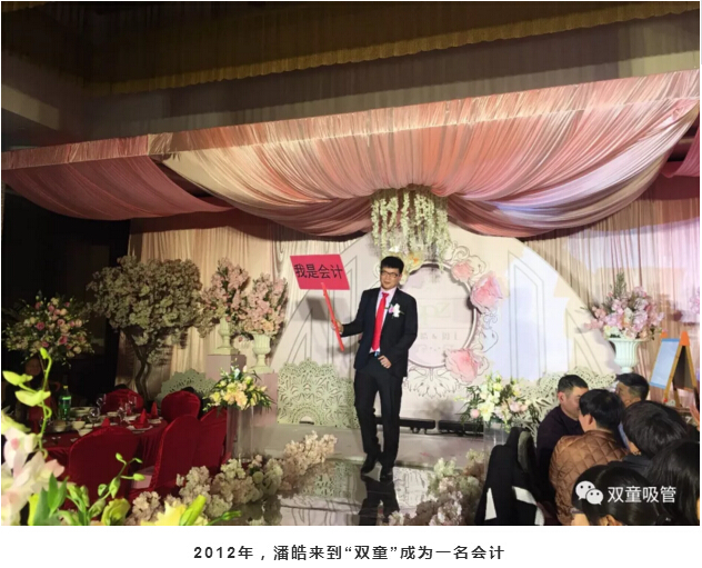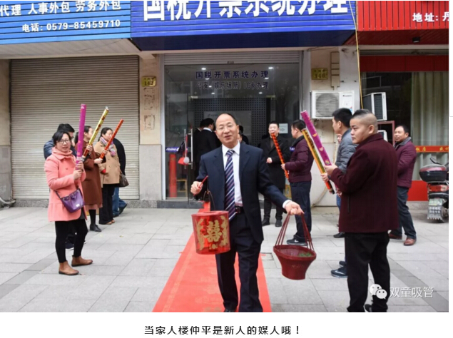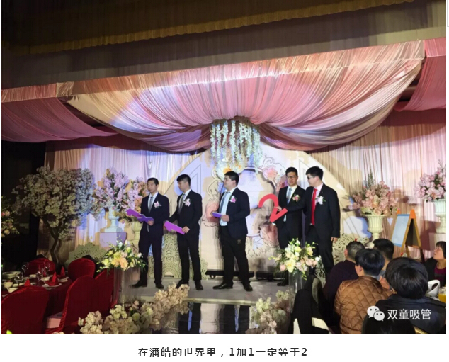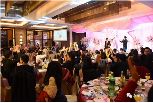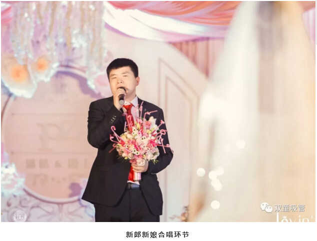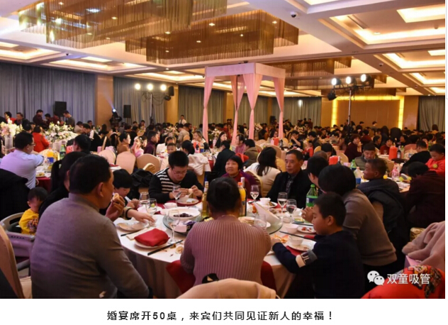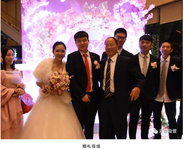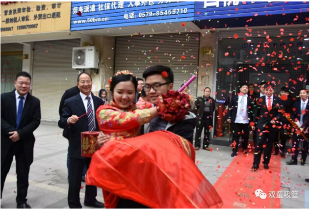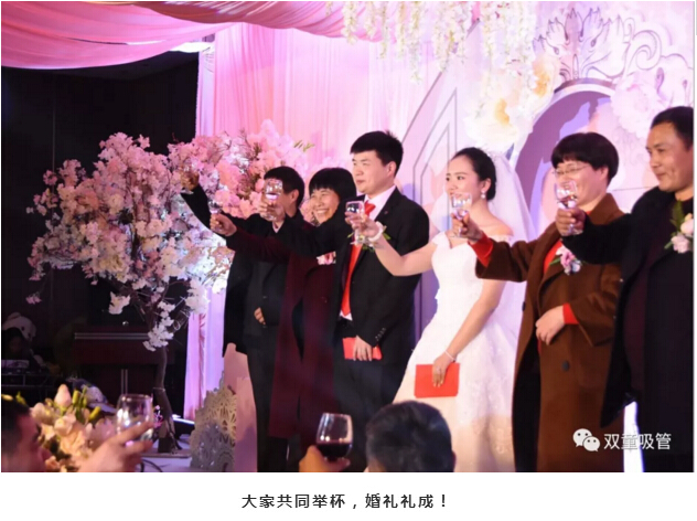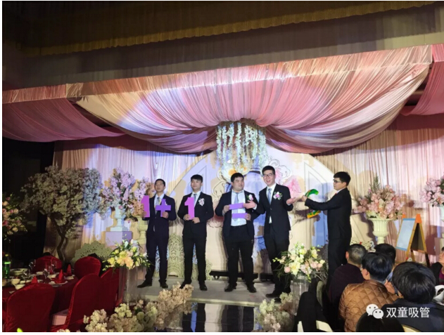 婚禮現(xiàn)場的亭子代表著新人的工作單位——“雙童吸管”