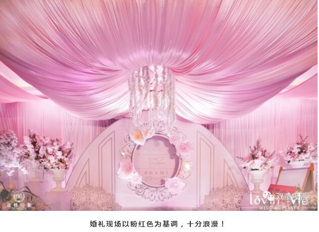 婚禮現(xiàn)場裝飾以粉紅色為基調(diào),非常浪漫?;檠缦_50桌,來賓們共同見證一對(duì)新人的幸福時(shí)刻!