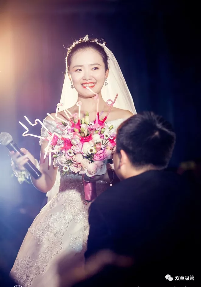 細(xì)心的粉絲一定發(fā)現(xiàn)了新娘吸管妞手中的捧花有所不同,這是新郎特地準(zhǔn)備的愛心吸管花。新郎說:“捧花里用的是雙童吸管的愛心情侶吸管。很多人都叫周上吸管妞,所以我覺得在今天的場合,送給吸管妞一束特別的愛心吸管花,她應(yīng)該會(huì)很開心?!贝嗽捯怀觯F(xiàn)場響起了熱烈的掌聲,婚禮也進(jìn)入了高潮。